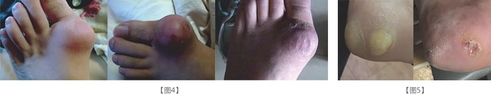 接受抗風(fēng)竤治療的部分痛風(fēng)患者在出現(xiàn)紅、腫、熱、痛、發(fā)燒等無菌性炎癥反應(yīng)之后,痛風(fēng)石隨之會(huì)出現(xiàn)明顯變軟、縮小的情,部分患者出現(xiàn)痛風(fēng)石表皮積液甚至尿酸鹽從腳部和手部直接排出的現(xiàn)象【見圖4、圖5】。還有一種情況,某些患者關(guān)節(jié)四肢表面原本沒有痛風(fēng)石,接受抗風(fēng)竤治療 后卻在腳背或者手背鼓起軟包。這是由于關(guān)節(jié)腔內(nèi)的尿酸鹽結(jié)晶快速溶解但未能及時(shí)排出引起的,堅(jiān)持治療幾天后就會(huì)代謝排出體外,不必?fù)?dān)心。